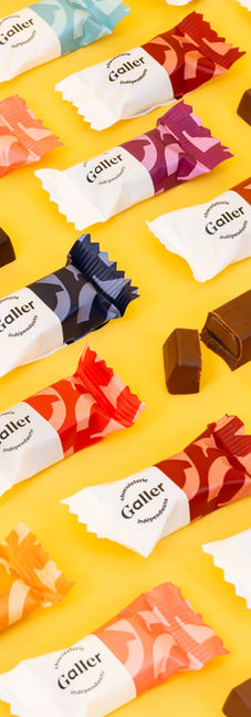 De la barrettes aux pralines, chaque produit Galler trouve son éclat sur son fond uni, dans une composition graphique et harmonieuse. —